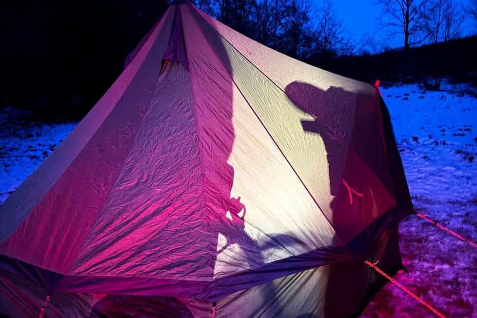 Sniegas, šaltis ir… palapinė. Ne vienam, pirmą kartą dalyvavusiam mūsų nuotykių savaitgalyje, tokia kombinacija neatrodė itin viliojanti. Kai lapkritį Rusnėje klausėme nuotykiautojų, ar apskritai verta statyti palapinę, ar gal visi nori miegoti viduje, girdėjosi tik nedrąsūs myktelėjimai: „gal“, „reiks pažiūrėti“ ir panašiai. Ai, pagalvojom, pastatysim ir tiek. Jei niekas nenorės – išmiegosim patys. Pastatėm ir…